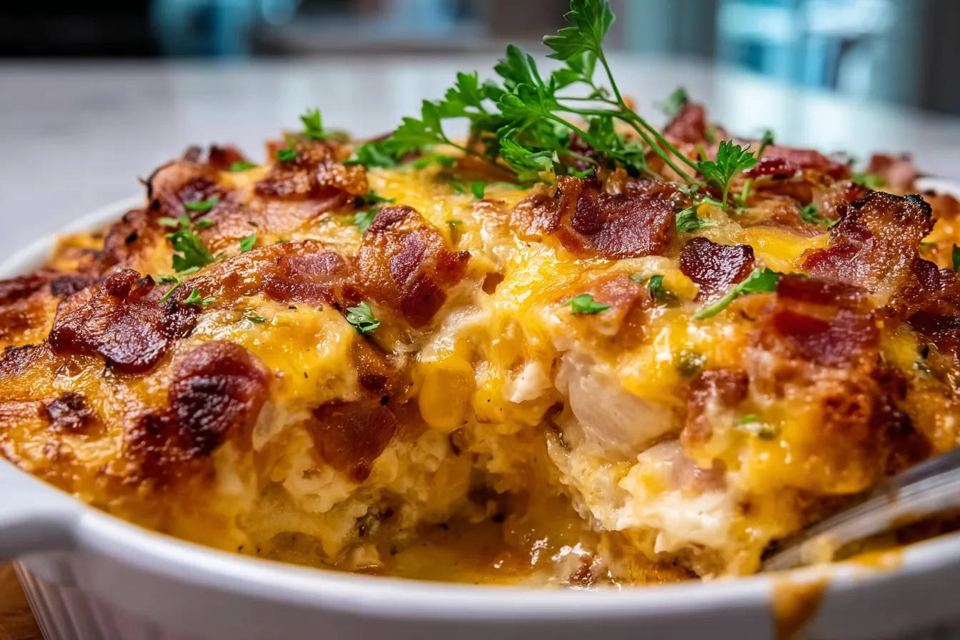 This Cheesy Chicken Bacon Casserole is a savory delight with layers of chicken, cheese, and crispy bacon, perfect for family dinners.