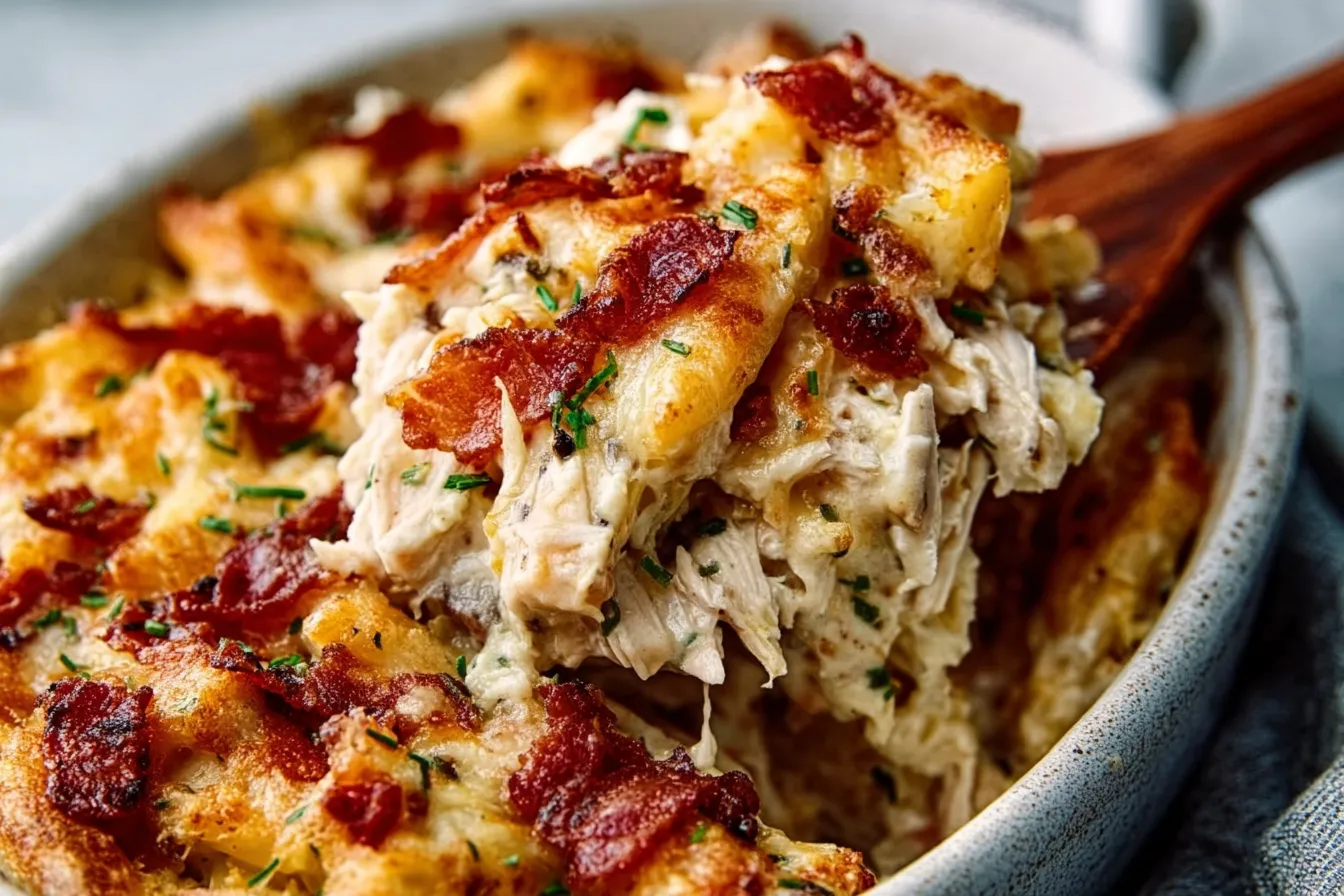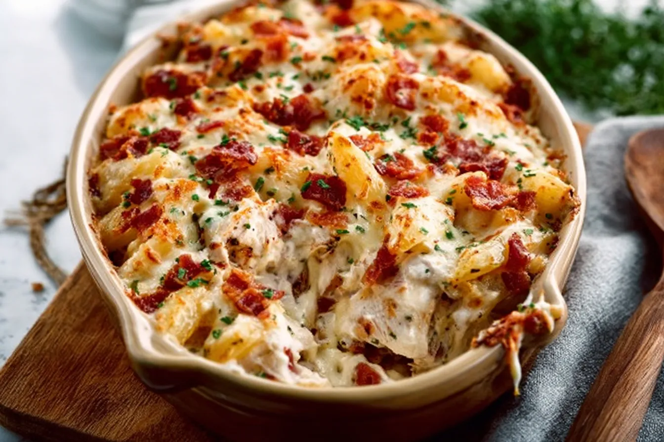 Indulge in this Cheesy Ranch Chicken Bacon Casserole packed with flavor perfect for a comforting family meal any night of the week 152 chars