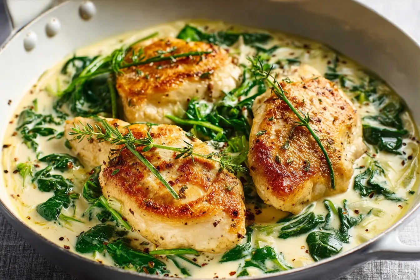 Creamy Garlic Spinach Chicken is a flavorful fusion that combines tender chicken breasts with a luscious cream sauce infused with garlic and vibrant spinach, perfect for a quick weeknight dinner.