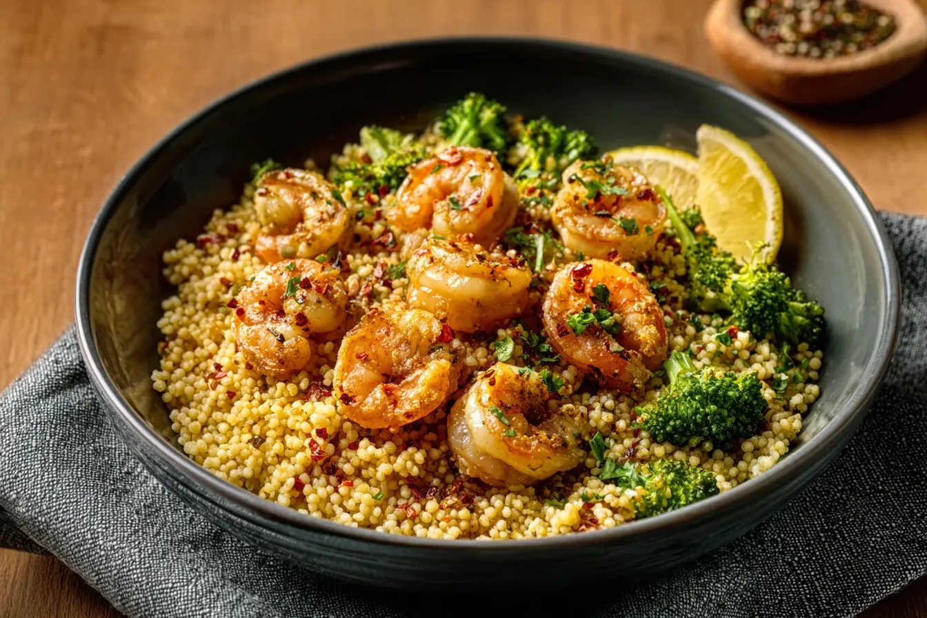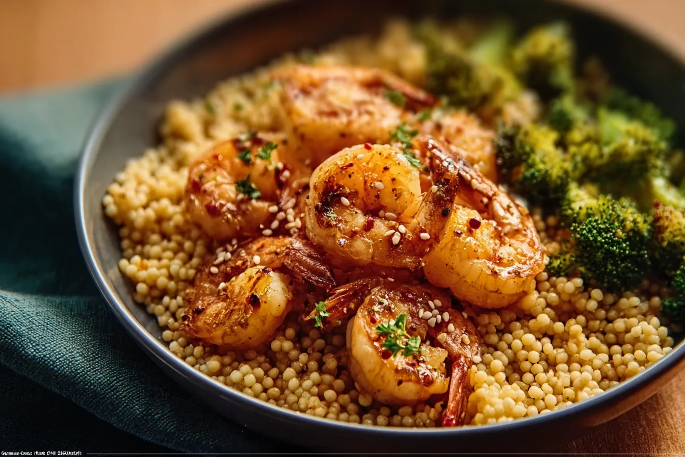 The shrimp provides essential amino acids, while couscous contributes dietary fiber, making this meal both satisfying and energizing.