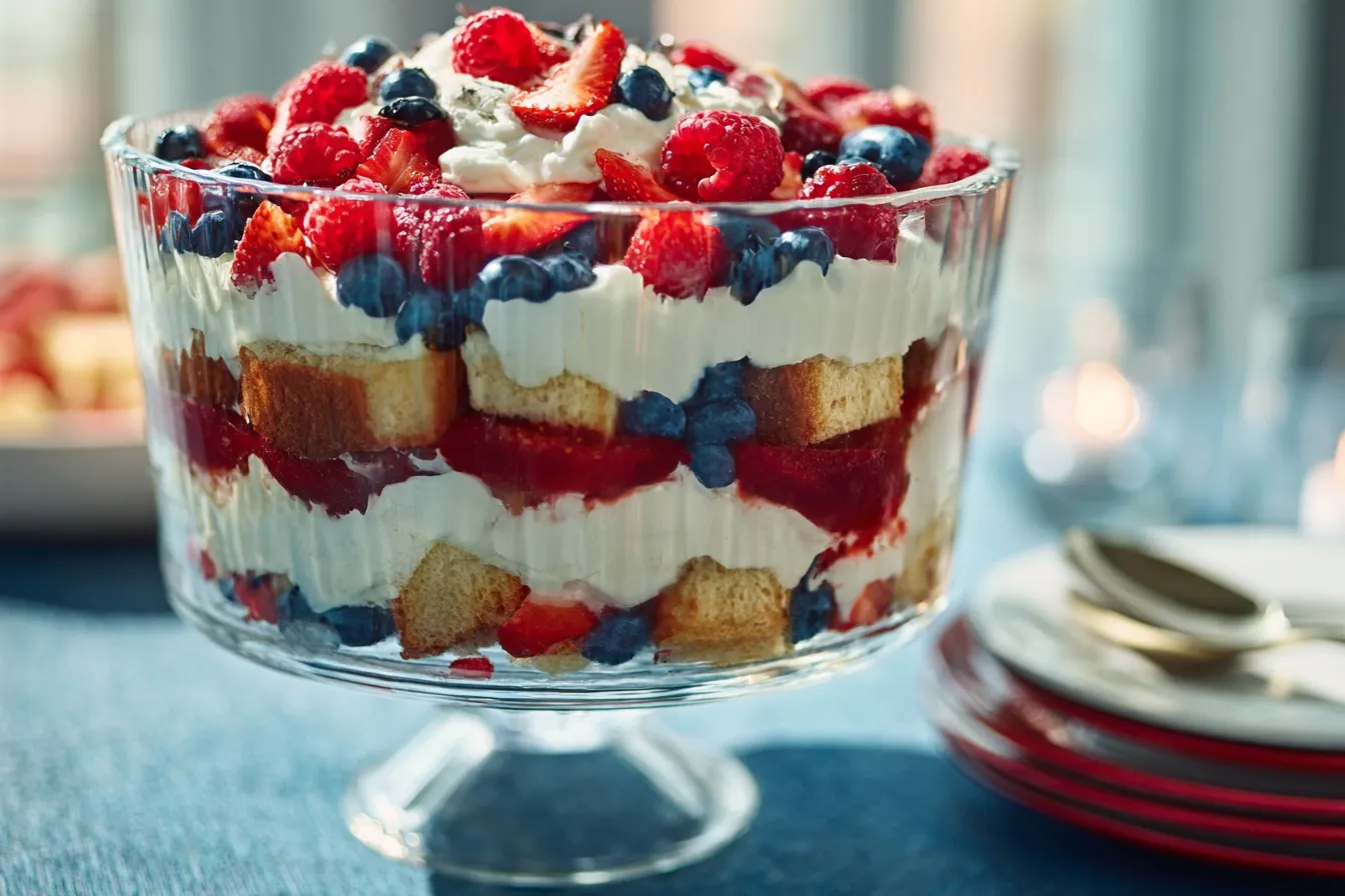 A visually stunning and delicious Patriotic Berry Trifle, perfect for Memorial Day celebrations, combining layers of fresh berries, whipped cream, and vanilla pudding.